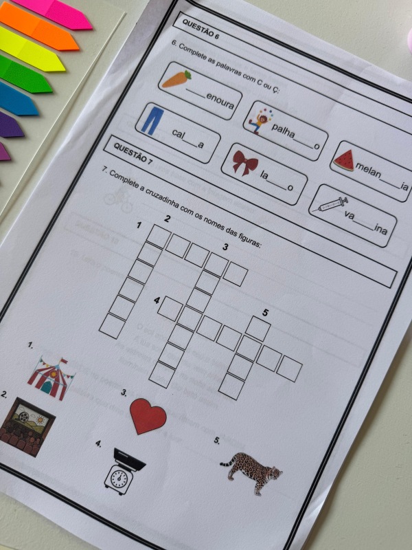 Português: leitura e interpretação; separação silábica; ortografia (C/Ç, certo/errado); formação de frases e rimas.