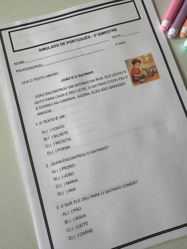 Português: leitura e interpretação do texto “João e o gatinho”; identificação de gênero textual; ordem alfabética; separação e contagem de sílabas; sílaba inicial.