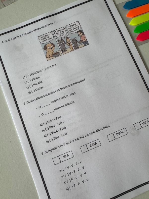 Português: leitura e interpretação de texto; identificação de gênero textual (HQ); ordem alfabética; sílabas e primeira letra; substituição de letras (T→D) para formar novas palavras.