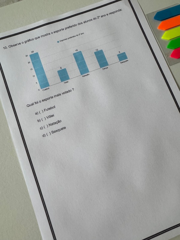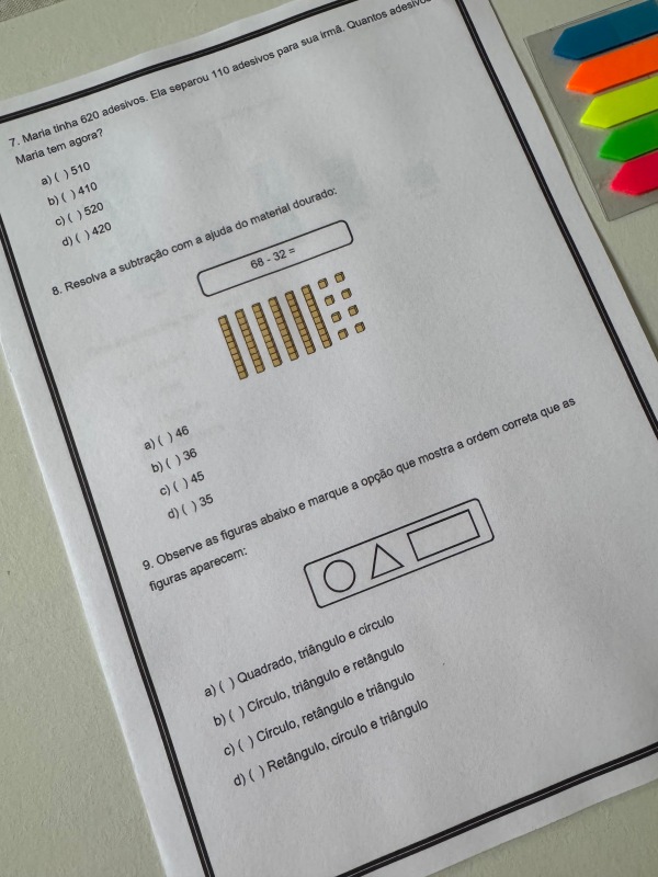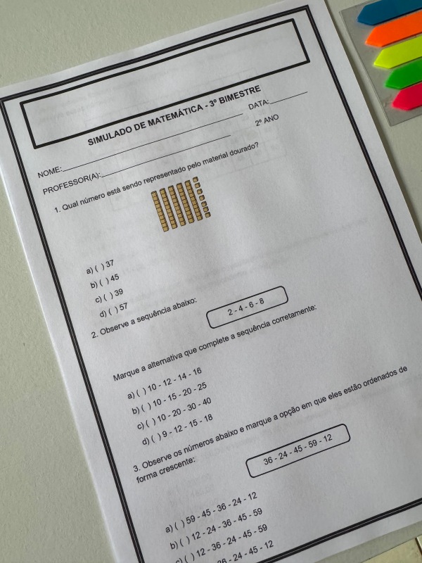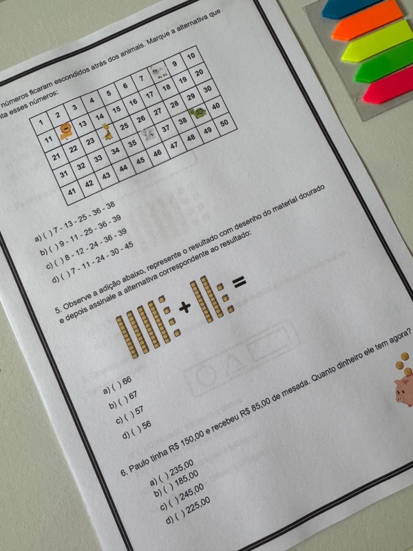 Matemática:material dourado (dezenas/unidades); sequências (contagem de 2 em 2); ordem crescente; números faltantes; adição e subtração em contexto; problemas com dinheiro; formas geométricas; leitura de gráfico de barras (esportes).